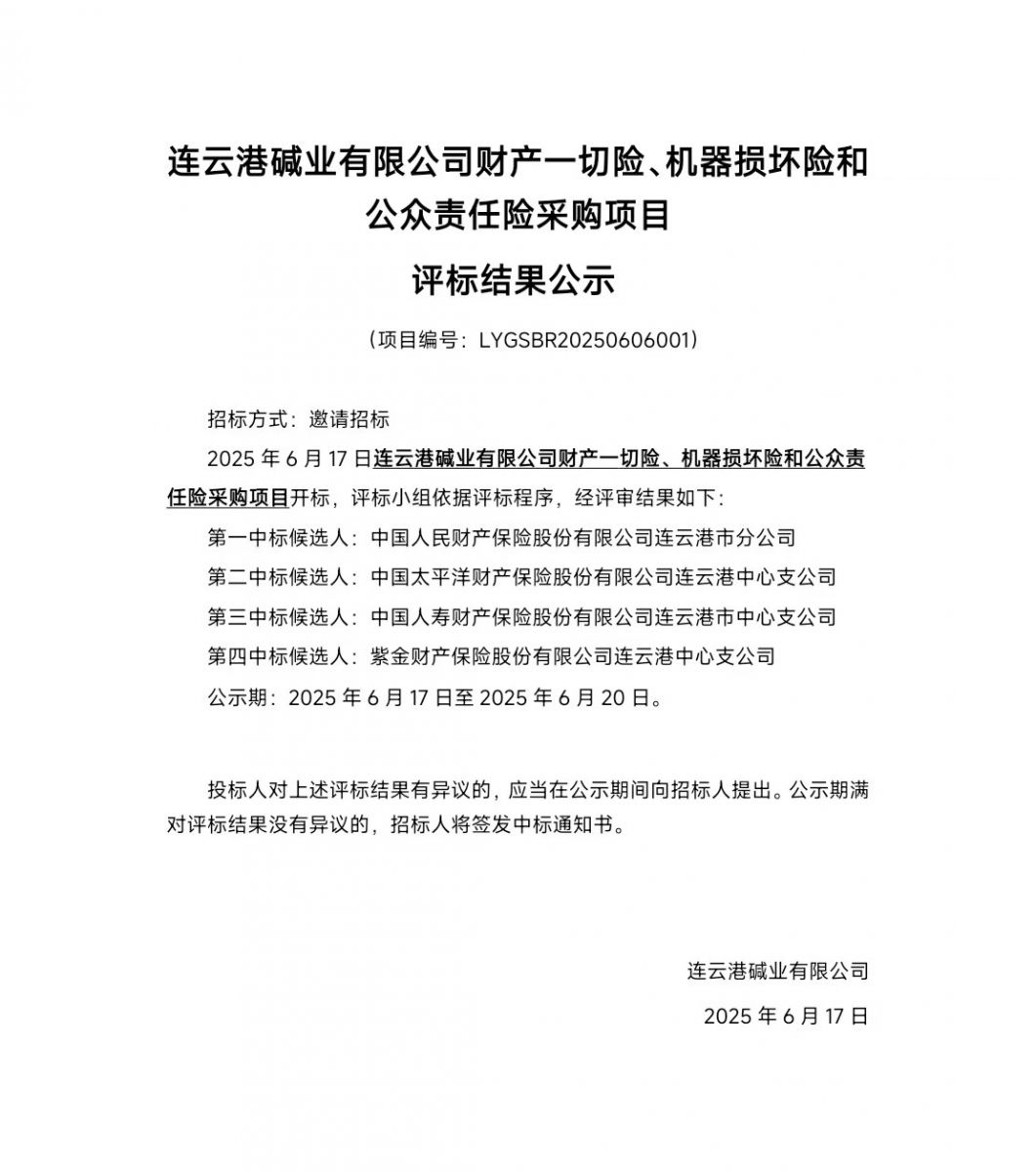 連云港堿業(yè)有限公司財產(chǎn)一切險、機(jī)器損壞險和公眾責(zé)任險采購項目評標(biāo)結(jié)果公示