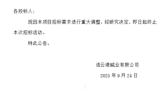 關(guān)于連云港堿業(yè)有限公司化工輔料甲醇采購終止招標的公告