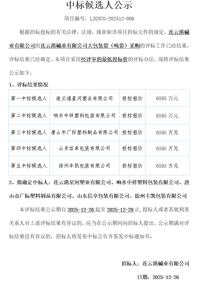 連云港堿業(yè)有限公司的連云港堿業(yè)有限公司大包裝袋(噸袋)采購中標候選人公示
