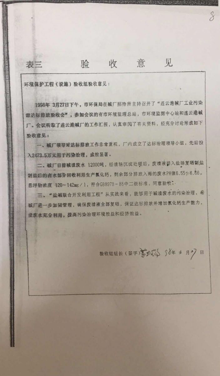 根據(jù)吉林化學工業(yè)公司設計院《連云港堿廠環(huán)境影響報告書》和原江蘇省環(huán)境保護局《關于對連云港堿廠環(huán)境影響報告書的批復》(蘇環(huán)管〔86〕31號)的要求,連云港堿廠產(chǎn)生的廢液送至渣場,經(jīng)澄清后,上清液經(jīng)自有排口閘直接排海。1997年,根據(jù)淮河流域水污染防治的要求,連云港市環(huán)保局向連云港堿廠下達了《關于淮河流域水污染源限期達標排放的決定》(連環(huán)管〔1997〕16號)。據(jù)此,連云港堿廠與臺北鹽場合作開發(fā)了“堿渣場上清液回收利用工程”項目,利用上清液制鹽、制鈣。1998年3月27日,該項目通過連云港市環(huán)保局組織的環(huán)保驗收,正式運行。