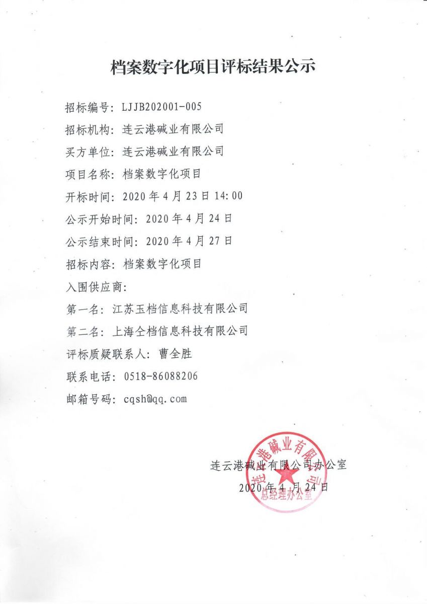 連云港堿業(yè)有限公司檔案數(shù)字化項目評標結果公示
