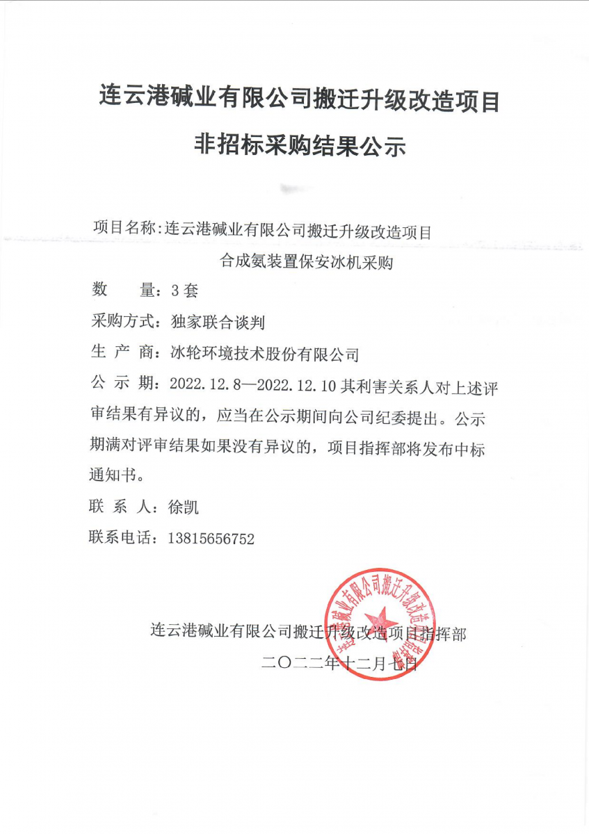 合成氨裝置保安冰機(jī)非招標(biāo)采購結(jié)果公示