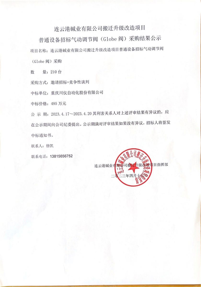 氣動調節(jié)閥(Globe閥)采購結果公示