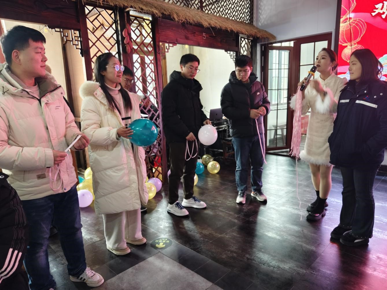 聯(lián)誼活動正式開始!首先,主持人通過抽取撲克牌的趣味游戲,為青年男女們分組配對,幫助他們打破冰層,迅速熟絡(luò)。緊接著,不同組的青年男女們積極踴躍地參加踩氣球、運氣球趣味活動,他們彼此間的距離也愈發(fā)拉進(jìn)。本次活動中,獲得游戲勝利的隊伍可以獲得紅包獎勵,而失敗的隊伍則需要接受懲罰,添加在場異性青年或隊友的微信。