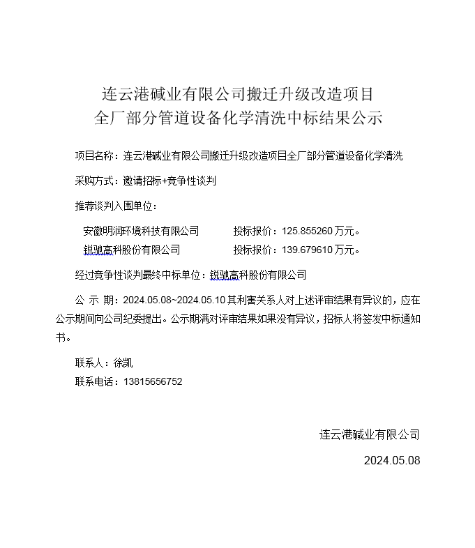 搬遷升級改造項(xiàng)目全廠部分管道設(shè)備化學(xué)清洗中標(biāo)結(jié)果公示