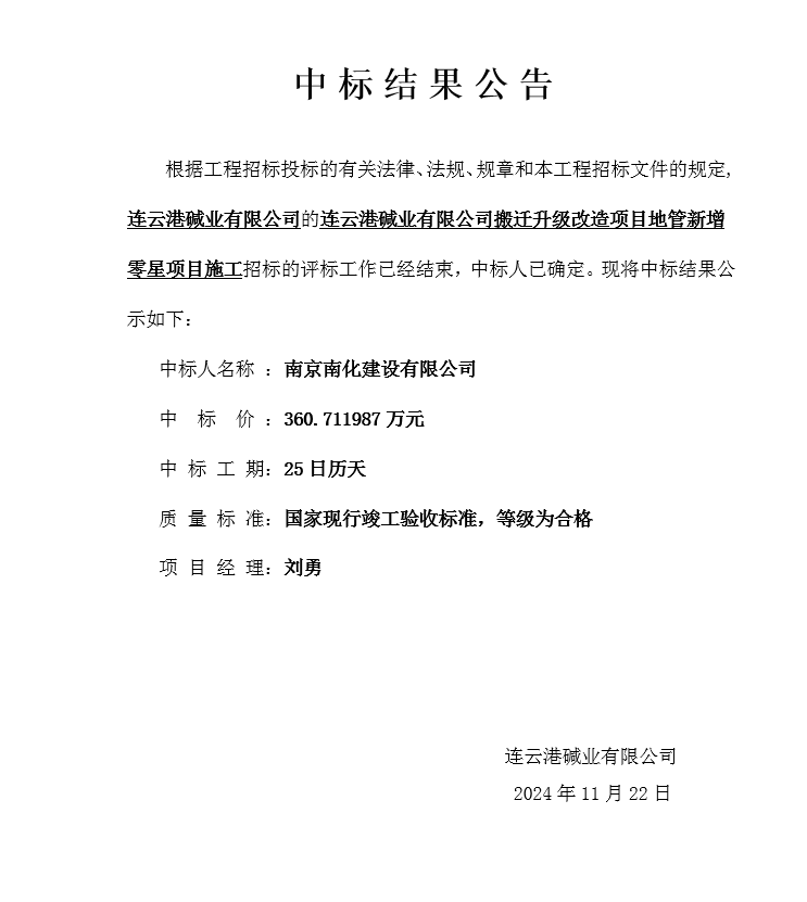 連云港堿業(yè)有限公司搬遷升級(jí)改造項(xiàng)目地管新增零星項(xiàng)目施工中標(biāo)結(jié)果公告