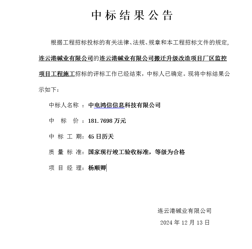 連云港堿業(yè)有限公司搬遷升級(jí)改造項(xiàng)目廠區(qū)監(jiān)控項(xiàng)目工程施工中標(biāo)結(jié)果公告