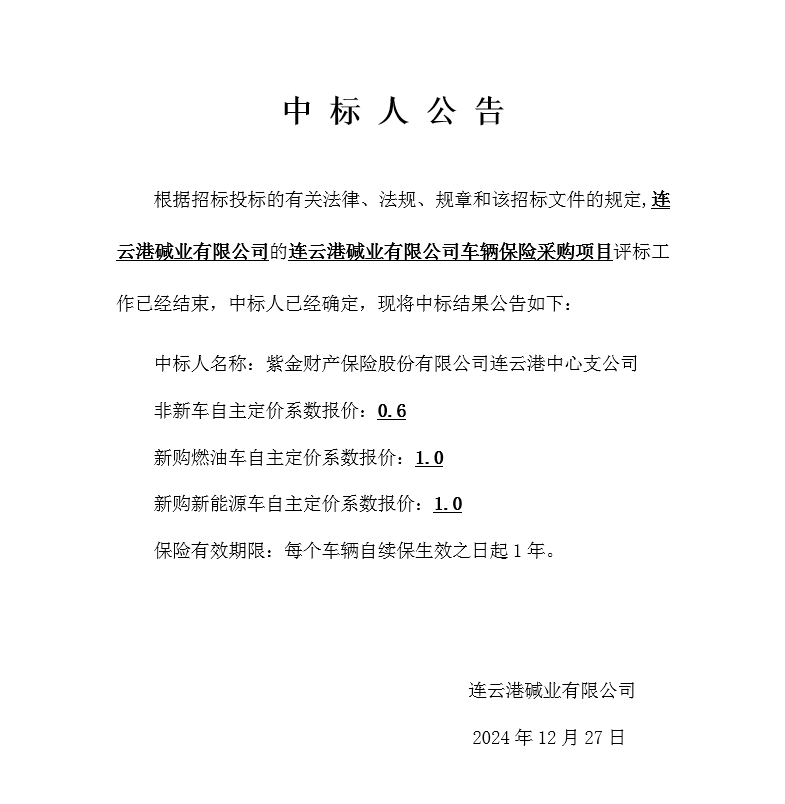 連云港堿業(yè)有限公司車輛保險采購項(xiàng)目中標(biāo)人公告