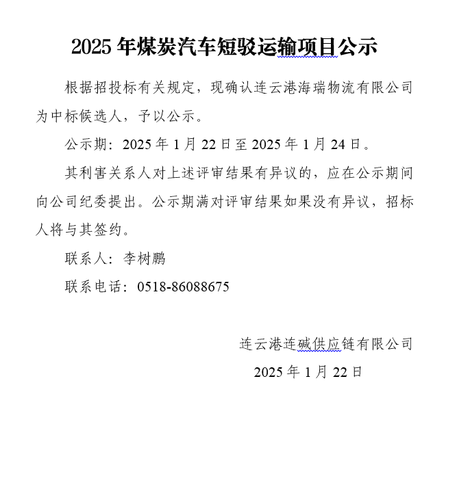 2025年煤炭汽車短駁運輸項目公示