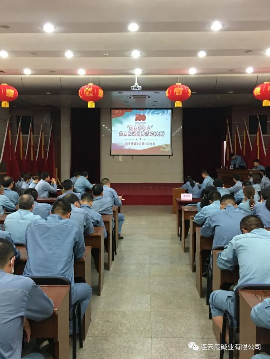 為慶祝中國共產黨成立100周年,激勵公司全體黨員干部更好地學習黨史知識、領悟黨史知識,6月10日,公司成功舉辦“知史踐初心”黨史知識競賽活動決賽,管理五、電儀、銷售、質檢、鹽水制鈣、運輸等六個支部參加決賽,公司領導班子成員及全體中層干部、分會主席、支部黨員代表觀看比賽。